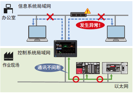 ● 通过2个以太网端口,对办公室的信息系统局域网与生产现场的控制系统局域网进行物理划分,构筑安全的网络结构。